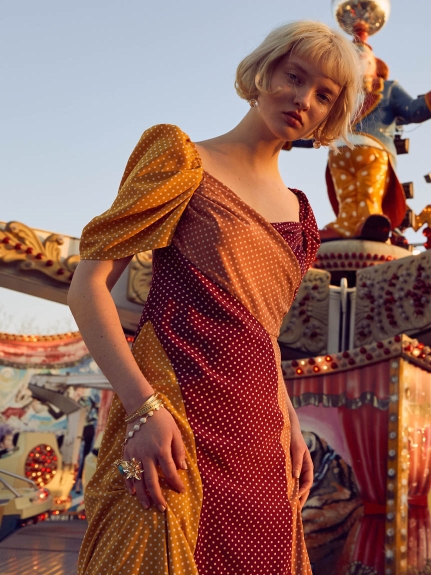 オフホワイトは黒の水玉、ベージュはピンクの水玉、ミックスは3色の生地を、それぞれ使っているのが特徴。クラッチバッグや大振りピアスなど小物を充実させれば、よりグラマラスな雰囲気が楽しめます。