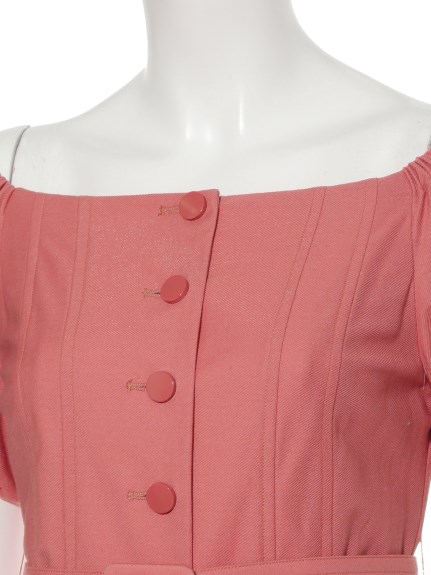 前面にボタンを配し、さらに共布の太ベルトでポイントを加えたデザインワンピース。大胆に肩を出しても大人っぽいし、あえて出さずに袖のパフスリーブを強調しても。