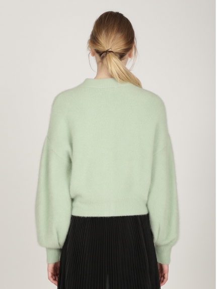 タックをあしらったボリューミーな袖が女性らしいカーディガンの登場。べっ甲カラーとパールを合わせたオリジナルデザインのボタンがレトロなアクセントになっています。