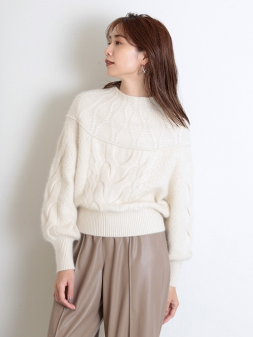 ふんわりとしたケーブル編みで、秋冬ならではの暖かみある立体感を表現したニット。やや広めのネックラインがデコルテに抜けを与え、カジュアルになり過ぎないようボリュームスリーブで女性らしいバランスを意識。首元から肩にかけて放射状の編み地を施すことで、身体の線が華奢に見えるよう工夫しました。パンツ合わせでデイリーに、艶のあるサテンやタイトスカート合わせでレディにと、シチュエーションに応じて様々なスタイリングが楽しめます。