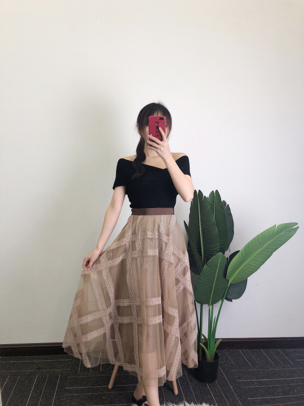 レーステープ調の刺繍で格子状にチェックを描き、クラシカルな雰囲気に落とし込んだ大人のチュールスカート。たっぷりのフレアでボリュームを出し、ブーツと合わせやすいミドル丈にデザインしました。ウエストにはグログランテープでアクセントをプラス。チュールと刺繍のカラーやファブリックのコントラストが美しく、シアーな透け感とチェックの存在感を絶妙なバランスで表現した一枚です。