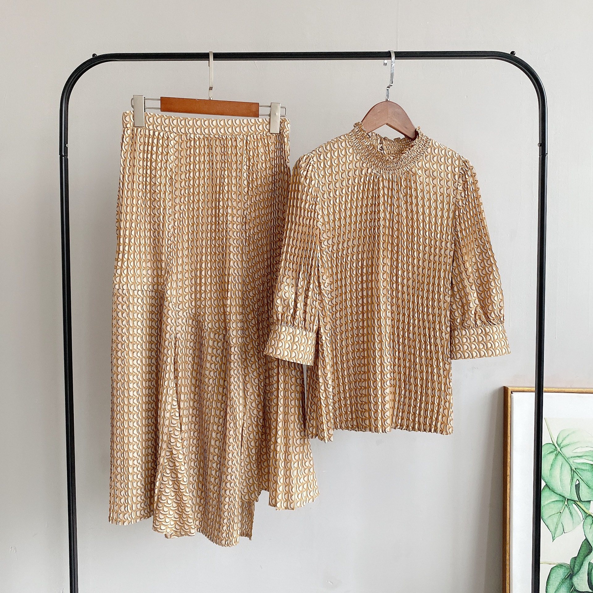 ジオメトリック柄やドット柄プリントを採用し、トレンド感のある表情でつくり上げたプリーツスカート。計算された切り替えやフレアー展開が、躍動感のある軽やかな足元を演出。プリーツスカートの持つ上品さはそのままに、アシンメトリーのイレギュラーヘムで新鮮さを呼び込みました。同素材のボウタイブラウス(品番F3086)と合わせれば、ワンピースのような着こなしが叶います。ほんのりとした艶が女性らしさを醸し、重ためのニットと合わせればコーディネートにリズムが生まれます。