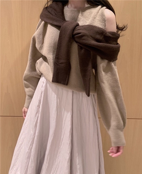 ニットにカーディガンを巻いているような、フェイクレイヤードデザインのプルオーバー。左サイドには大胆な肩あきディテールを施し、ニットのボリュームとバランスを取りつつ、身体が華奢に見えるよう工夫しました。肩にかかるカーディガンがしなやかな色香を纏い、カジュアルなシルエットでも女性らしさが漂います。違う編み地のニットを組み合わせることで奥行きが生まれ、異素材ミックスの遊び心も表現しました。