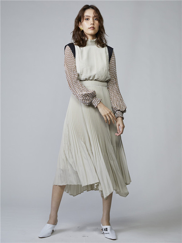 艶のある生地に2種類のプリーツを施し、プリント切り替えや細かなディティールを贅沢に散りばめ、ドラマティックに仕上げたワンピース。首元、袖にシャーリング、ウエストにもプリーツをあしらうことで、全体にメリハリを与えつつヴィンテージシックな面持ちを表現。上品なスタンドネックに対し、軽やかに揺れるイレギュラーヘムが歩く度に揺れ、女性らしさを高めます。