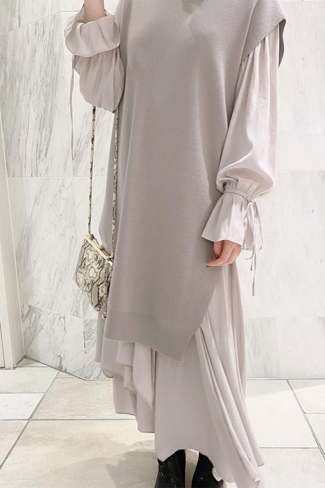 一枚で旬のレイヤードコーディネートが完成する、ニットベストとロングワンピースのセットアイテム。品の良い総針編みのベストと光沢感のあるワンピースを掛け合わせることで、ほっこり見えを回避し都会的な印象へと昇華させました。スタンドカラーとフレンチスリーブが大人な印象のベストは、ワンピースが見えるよう計算してデザインした深いスリットがポイント。ベストから見える部分にアクセントを持たせたワンピースは、袖と裾のフェミニンなディティールで女性らしさを表現しました。それぞれセパレートでも着用でき、ニーハイブーツやロングパンツを合わせ、今季ならではのスタイリングをお楽しみください。