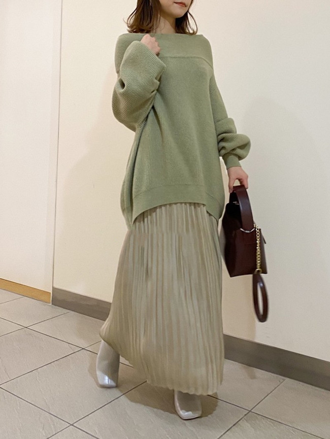 一枚で旬のコーディネートが完成する、ニットとスカートのセットアイテム。アシンメトリーデザインのニットは、着るだけでトレンド感のある表情に。伸縮性のあるリブ編みを採用しているので、肩の落とし具合は自由に調整いただけます。存在感のあるオーバーサイズですが、軽い仕上がりでストレスフリーな着心地を叶えました。袖の内側にはタックをあしらい、綺麗なボリュームがキープ出来るよう工夫しています。オーロラに輝くプリーツスカートは、Iラインにすることで新鮮なシルエットに。それぞれセパレートでも着用でき、抜群の着回し力でコーディネートを彩ります。