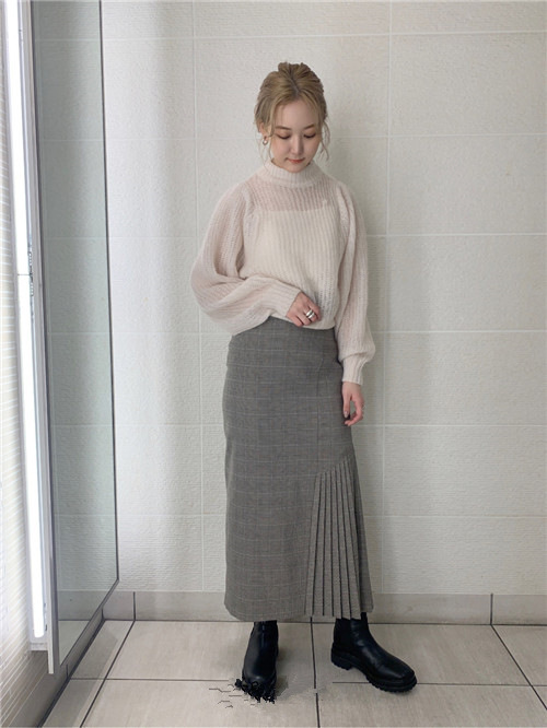ローゲージのざっくり感とモヘアのふわふわな質感を掛け合わせた、華やかな透け感が魅力のニット。モックネックで品の良さをキープしつつ、広めのアームホールとボリュームスリーブで愛らしさを演出。しっかりと詰まった太い裾リブがウエストカーブにフィットし、IN/OUTどちらも綺麗に映える美しいシルエットを実現しました。ハイウエストボトムスと相性の良い丈で、ナロースカート(品番SWFS205078)とのコーディネートがおすすめ。インナーキャミソールがセットになっています。