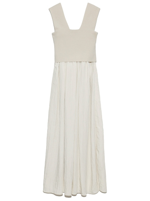 ニットビスチェを着ているような見え感が特徴で、裾をめくると内側はスカートとドッキングされており、表からは裾のウエストラインを縫い留めないフラシにすることで、スカートのギャザーの膨らみを抑え、重ね着をしているようなレイヤードデザインを作り出し、1着で心地よく着られます。