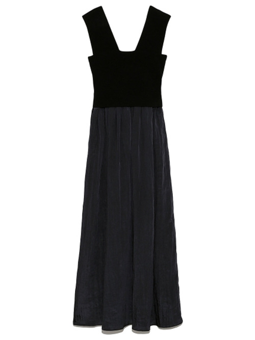 ビスチェ型のニットはヴィスコースナイロン糸の総針編みで、体にフィットするような心地よさ、太幅の肩ラインと背面のゴムでアンダーウェアを気にしないで着られます。