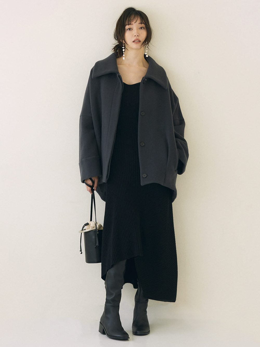 リブの編地を変化したように見えるキレイなデザインも特徴で、ウエストラインからしなやかに広がるフレアシルエット、裾は前上がりのアシンメトリーなヘムラインでモードな印象をプラスします。