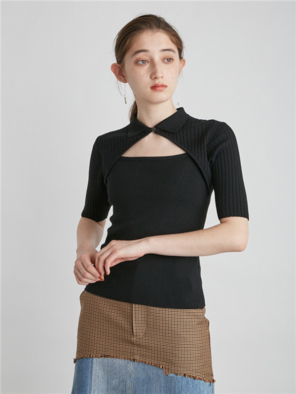 リブ編みのポロニットをトレンド感のあるカットアウトデザインでご用意しました。カジュアルなアイテムもセンシュアルな肌見せをプラスすることで、女性らしい色香漂うスタイリングが叶います。身頃の編地には変化をつけ、ウエストラインがすっきりと見える工夫を施しました。半袖なので、秋のはじまりからシーズン長くお楽しみいただけます。フェミニンなスカート合わせは勿論、肌見せで抜け感のあるデザインなのでパンツ合わせもカジュアルになりすぎず、おすすめです。