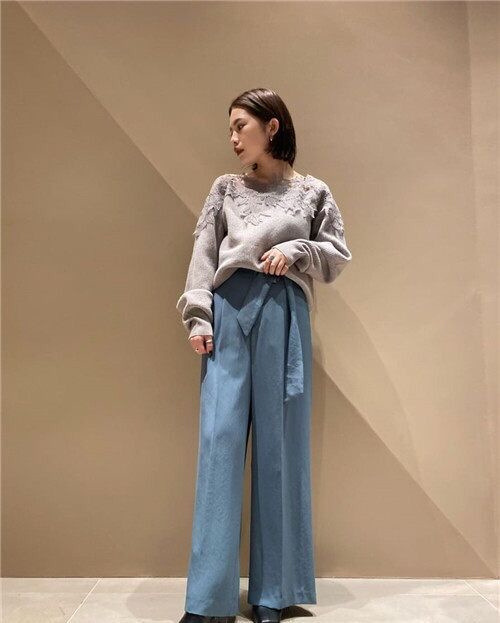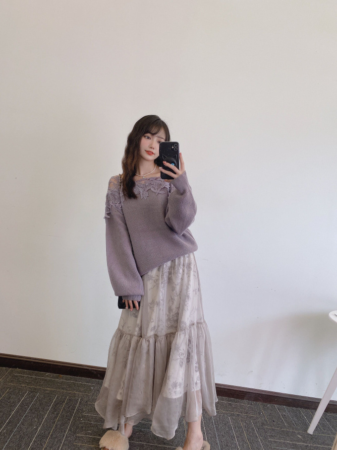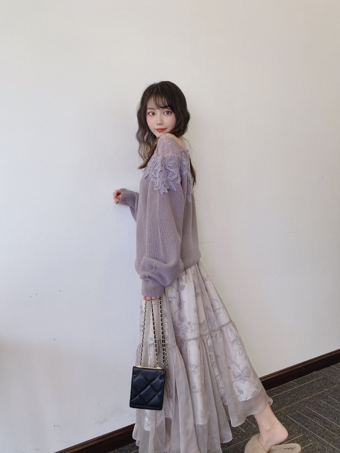 畦編みニットのオフショルラインに合わせたレースディテールで、ほんのり透ける肌見えがデコルテをキレイに見せてくれます。