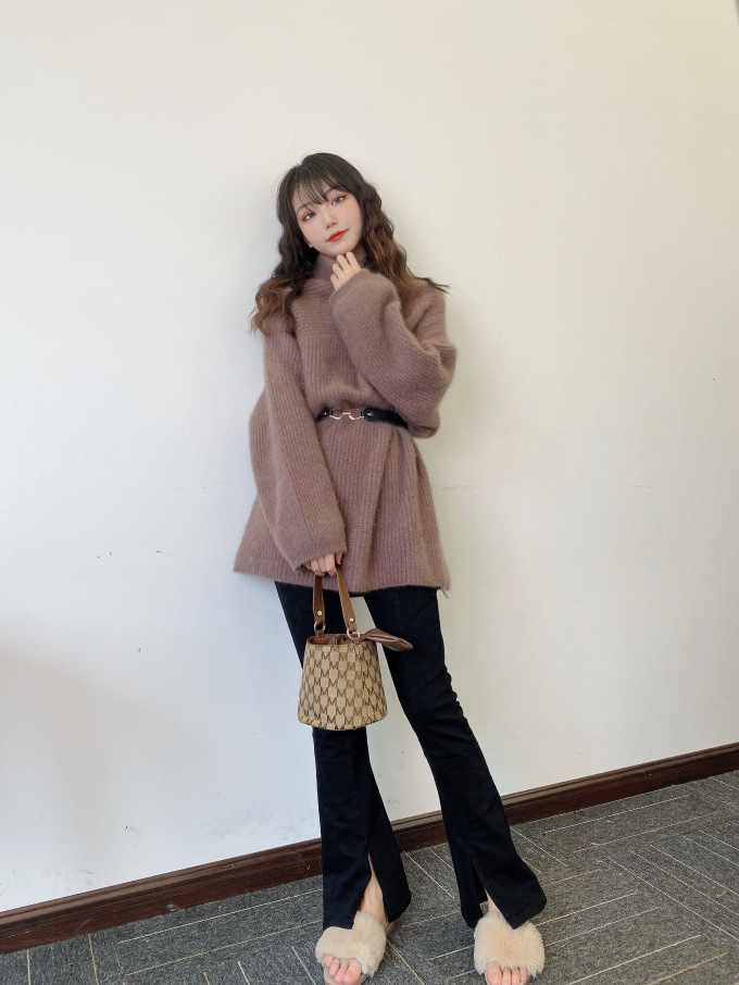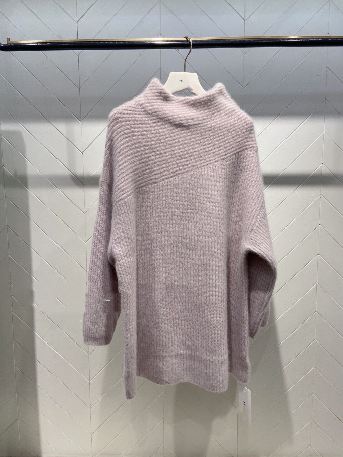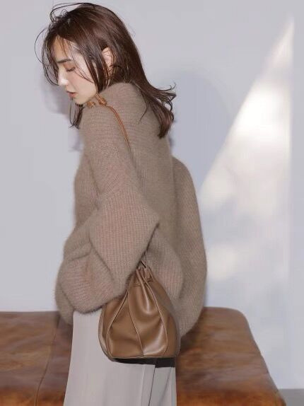 肩の付近で斜めにシームを入れて、編み方向に変化をつけたアシンメトリーなデザインでモード感高まる装いに。