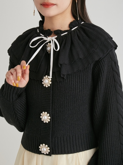 配色のベロアリボンをあしらったダブルカラーがクラシカルなニットカーディガン。ギャザーを寄せてフリルを作り、フェミニンな印象に仕上げました。ジュエリーのようなパールボタンで華やかさをプラスし、ふんわりとしたボリュームスリーブにはケーブル柄を入れ、表情の違いを楽しめるデザインに。デイリーに活躍するアイテムなのでスカートは勿論、あえてデニムに合わせてカジュアルダウンしたスタイリングもおすすめです。