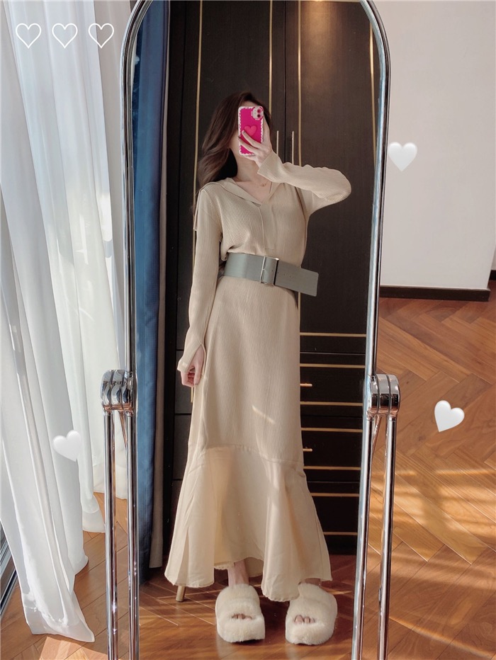 【フェミニンなシルエットとモードのビックカラーをバランス良くミックスしたリブニットワンピース】