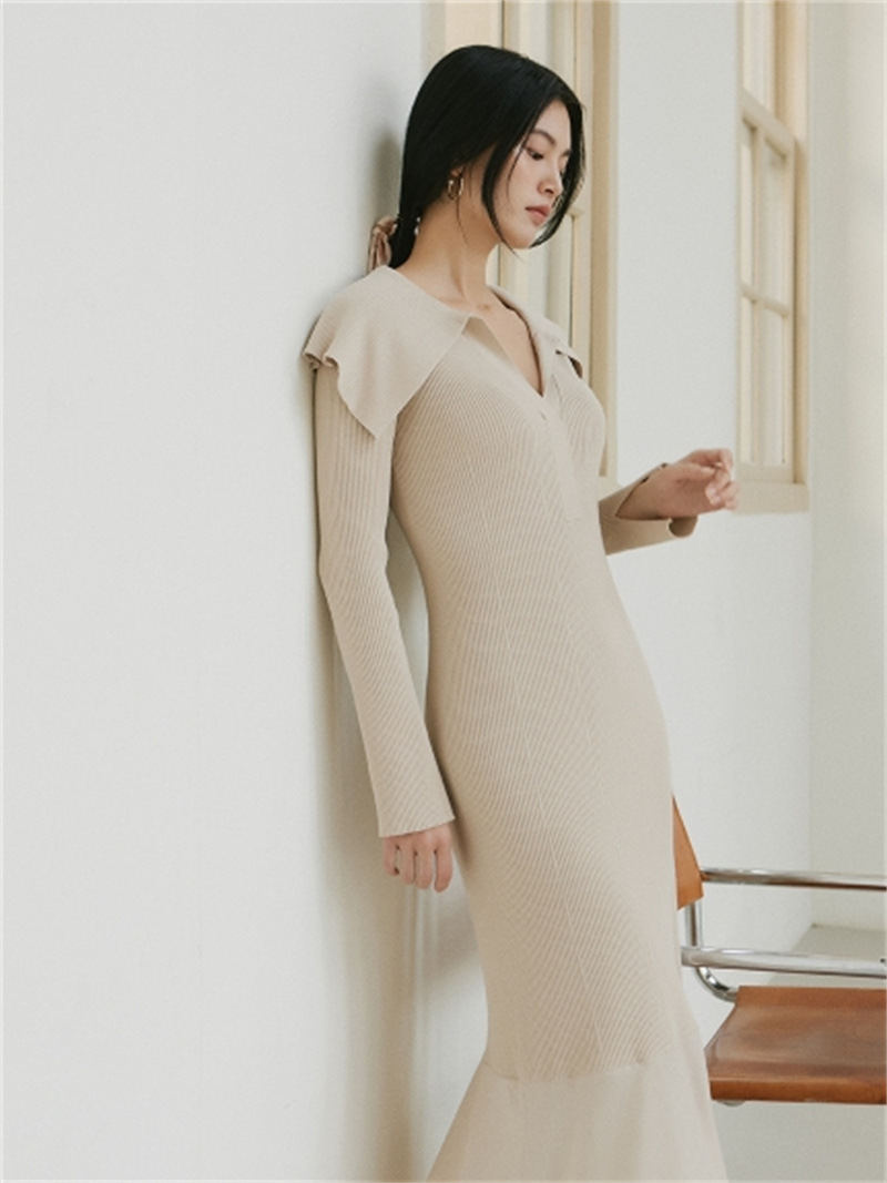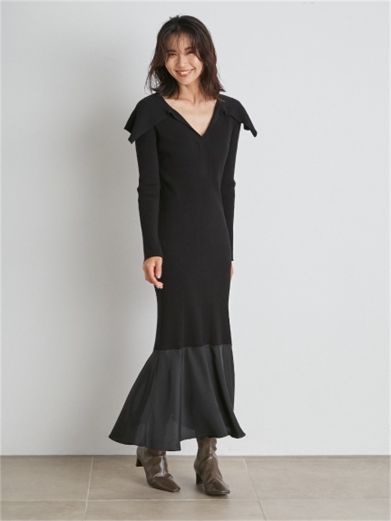 トレンドのビックカラーでアクセントを効かせたロングニットワンピース。女性らしいボディラインを強調するフェミニンなシルエットと、モードなビックカラーをバランス良くデザインし感度高く仕上げました。膝上までは身体の線を拾いすぎないナチュラルフィットなナロー、膝下から華やかに広がるフレアでマーメイドのようなエレガントなフォルムを描きました。イージーな着心地とレディな印象を両立させたニットワンピースは、1枚でコーディネートが完成する秋冬のワードローブに活躍するアイテムです。