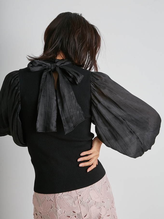 エッジを効かせた胸元のカッティングが目を惹くニットプルオーバー。レイヤード風に胸元の開きを作ることで、セクシー見えを抑えモードで個性的な表情を叶えました。襟、ボウタイ、袖には凸凹とした表面感のあるシアー生地を使用。ボリュームのあるシアースリーブとリブニットの相性が抜群で、ボウタイは取り外し可能なので印象を変えてアレンジいただけます。コンパクトなサイズ感はパンツ・スカート共にコーディネートしやすく、ジャンパースカートのインナーとしても存在感を発揮します。