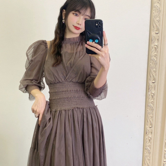 ボリュームたっぷりのロマンティックなチュールドレス。身頃と袖は切り離しているので、少し隙間を開けてスリットから肌を見せたり、肩まで落としてオフショルダーにしたりと、2WAYで楽しめる仕様です。ウエストシャーリングでメリハリをつけ、女性らしい身頃とスカートのシルエットに緩急をプラス。贅沢に生地分量を使用したスカートは歩く度に揺れ、優美なルックスでレディムードを加速させます。