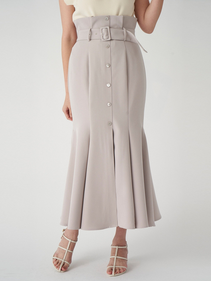 女性らしいラインを綺麗に魅せる美しいマーメイドシルエットが印象的なスカート。フロントにあしらわれたボタンが縦のラインを強調し、スタイルアップ効果をさらに高めてくれます。付属のベルトでマークしたハイウエストデザインはトレンド感◎。後ろファスナーを備えているので簡単に着脱でき、穿き心地も快適です。