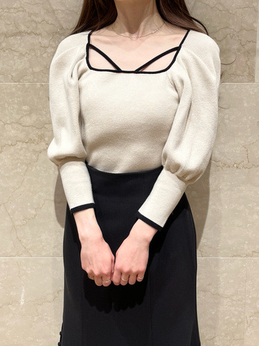 たっぷりとタックを効かせ丸みを持たせたボリュームスリーブが印象的な、レディムード溢れるニットプルオーバー。デコルテにあしらわれたセンシュアルなストラップでトレンド感をプラス。身頃部分はすっきりとしたラインに仕上げ、スタイルアップを狙えるメリハリシルエットをメイクしています。パンツともスカートともバランス良く決まり、着まわしやすいのも嬉しい。