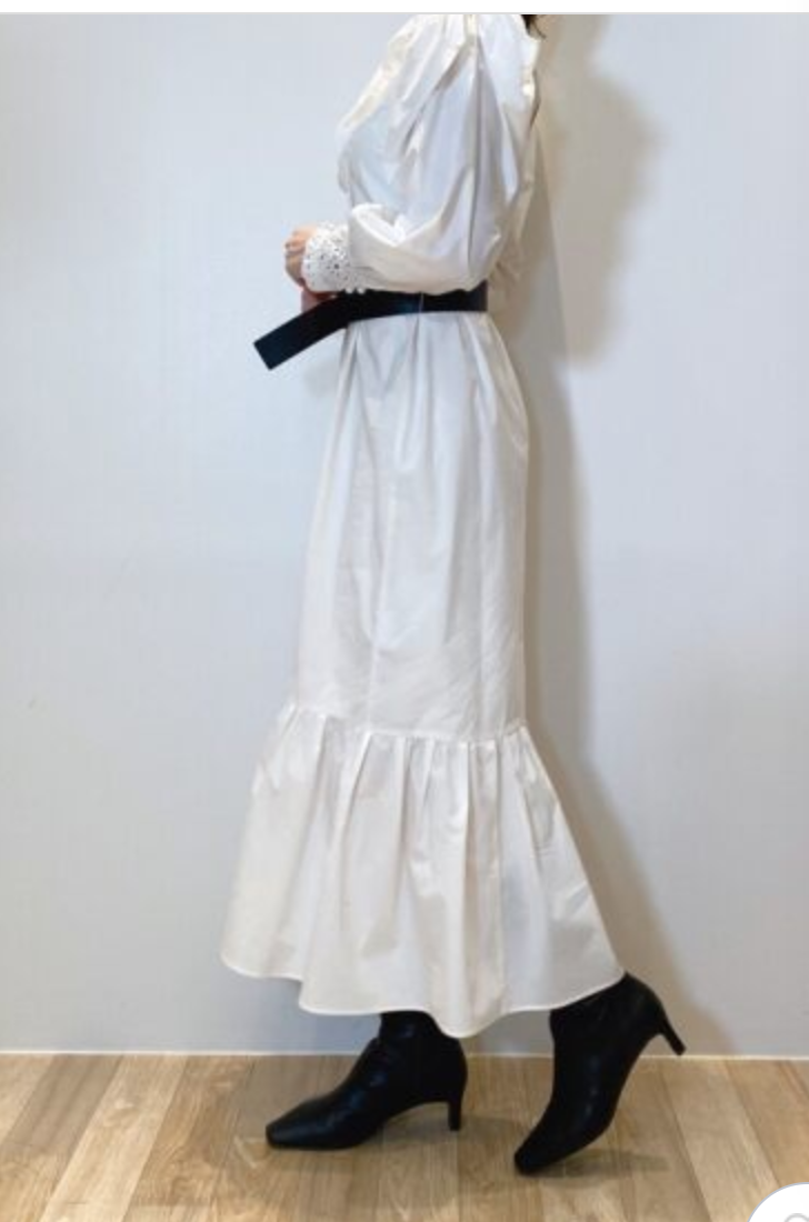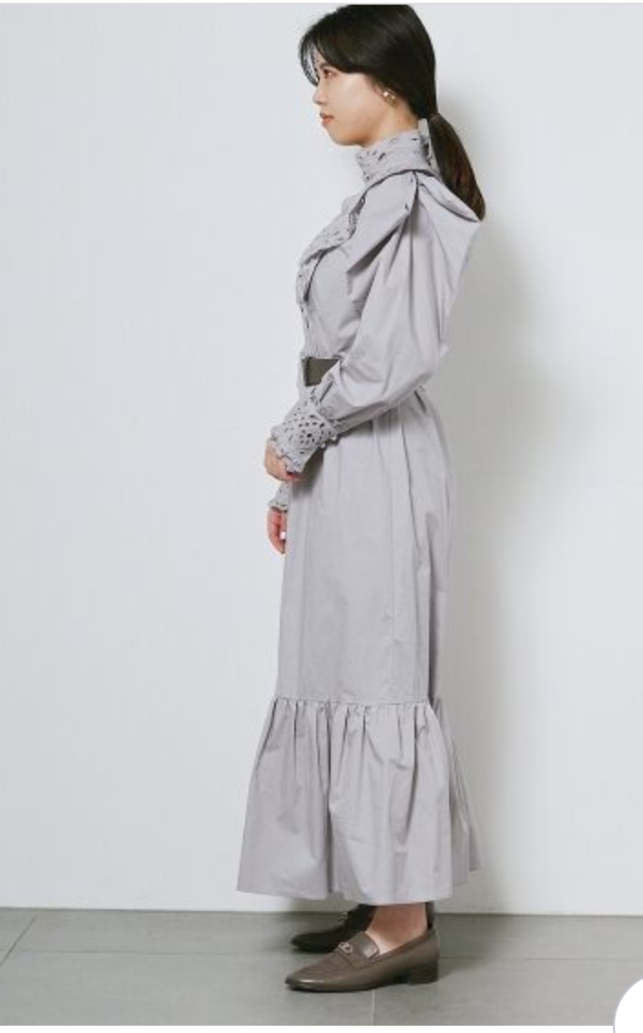 春らしい軽さのあるパンチングレースを繊細な手法で取り入れた、クラシカルレディなワンピース。襟ぐりまで刺繍が施されたスタンドカラーや巧妙にタックを効かせた立体的なパフスリーブなど、細部にまでこだわった1着です。裾の切り替え部分にたっぷりとギャザーを入れたマーメイドシルエットで一気に今年らしい仕上がりに。クールなレザーベルトやマニッシュなジレをプラスした甘辛MIXスタイルがおすすめです。