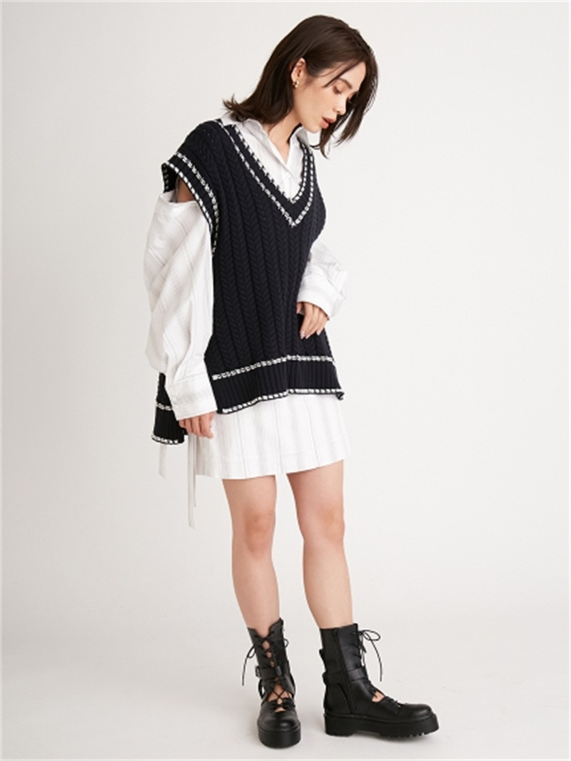 昨シーズンからトレンドが続くニットベストをレイヤードしやすいオーバーサイズにアップデート。配色のステッチを効かせ全体に変形のケーブル模様を浮かべることで、「SNIDEL」らしいモードながら柔らかなルックスに仕上げています。ストライプシャツにレイヤードすれば、トレンド感溢れる着こなしが即完成。トップスとしてロングパンツなどとコーディネートするのもおすすめです。