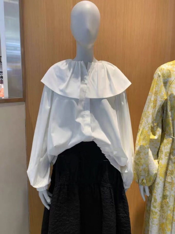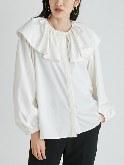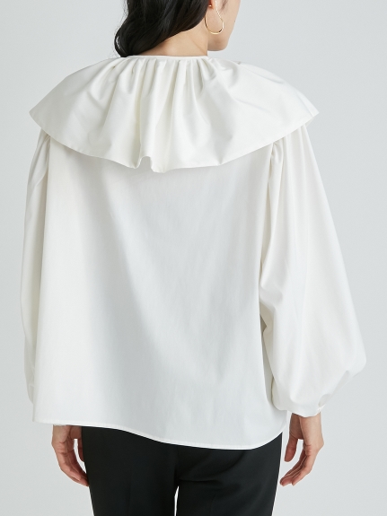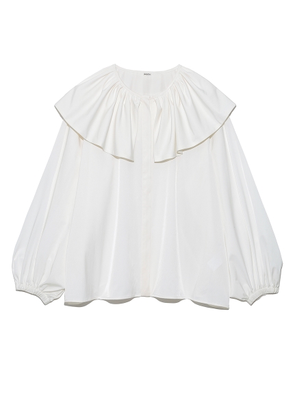大胆にあしらったラッフルカラーがトレンド感たっぷり。大振りフリルが際立つように、フロントは比翼仕立てにし、スッキリ仕上げました。フリルから繋がるように、身幅はワイドなフレシルエットに。袖口に平ゴムを入れたボリューム袖も、フェミニン気分を盛り上げます。全体的にゆったりしているので、体型カバー効果も上々。一枚ではもちろん、冬本番はざっくりニットカーデなどとレイヤードして楽しんでも◎。