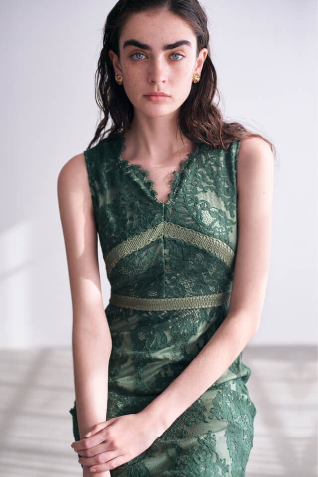 シアーなドットチュールとフラワーレースを重ね合わせた、エレガント&モードなオケージョンドレス。それぞれのマテリアルの色を変えることで、奥行のある美しい表情を演出しています。分量感たっぷりに広がるマーメイドシルエットでトレンド感もしっかりとKEEP。それぞれ別々にして他のアイテムとも組み合わせられるので、これだけでコーディネートの幅は一気に広がります。