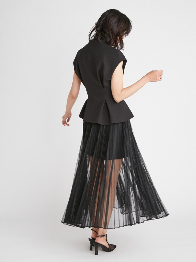 ジレは品の良いしなやかなマテリアルを使用し、スカートは透明感のあるチュール素材を使用。着まわしやすく定番のブラック&モカに加え、女性らしい優しいニュアンスのラベンダーの3色をご用意しました。