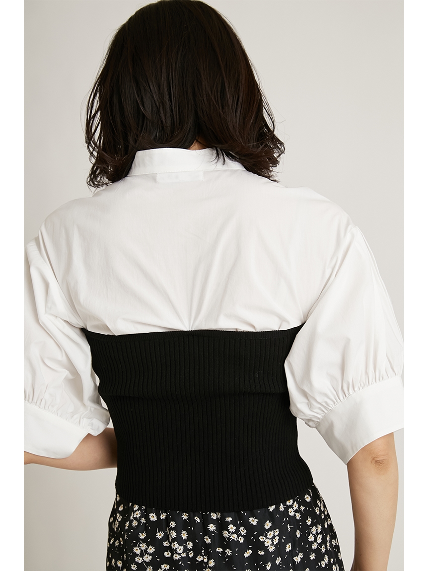 ややゆったりとしたサイズ感のシャツブラウスにビスチェをレイヤードしたかのような、ドッキングデザインのトップス。バンドカラーや太幅のカフスを採用し、モード感をプラスしています。立体的な編みで美しいボディラインを演出するビスチェで女性らしさは一気に加速。一見小さめながら伸縮性があるので着心地も快適です。
