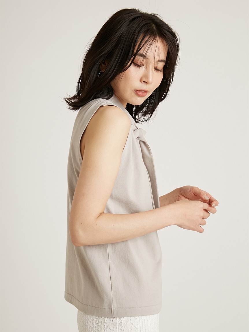 首元でキュッと結んだボウタイリボンが印象的な、清楚で女性らしいノースリーブカットソー。ショルダー部分にギャザーを効かせることで柔らかなニュアンスをプラス。全体をワンカラーでまとめた品の良いルックスなので、デイリーからオフィスシーンまで幅広く活躍してくれます。パンツともスカートとも合わせやすいすっきりとしたシルエットも◎。