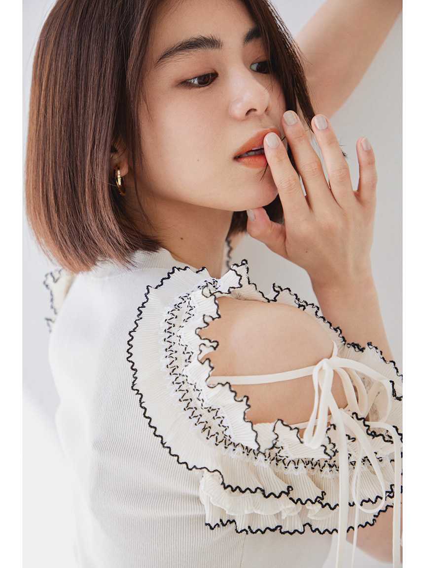 人気のダブルフリルニットプルオーバーがアップデートして登場。シャーリングにステッチを施し、色を配色にすることでトレンドライクに仕上げました。ダブルリボンは前シーズンのデザインをそのままに二の腕部分に落とし込み、愛らしさと華奢見えを演出しています。フィット感のあるタイトシルエットなので合わせるボトムを選ばず、着まわし力も抜群です。