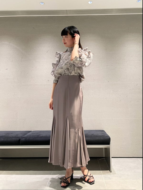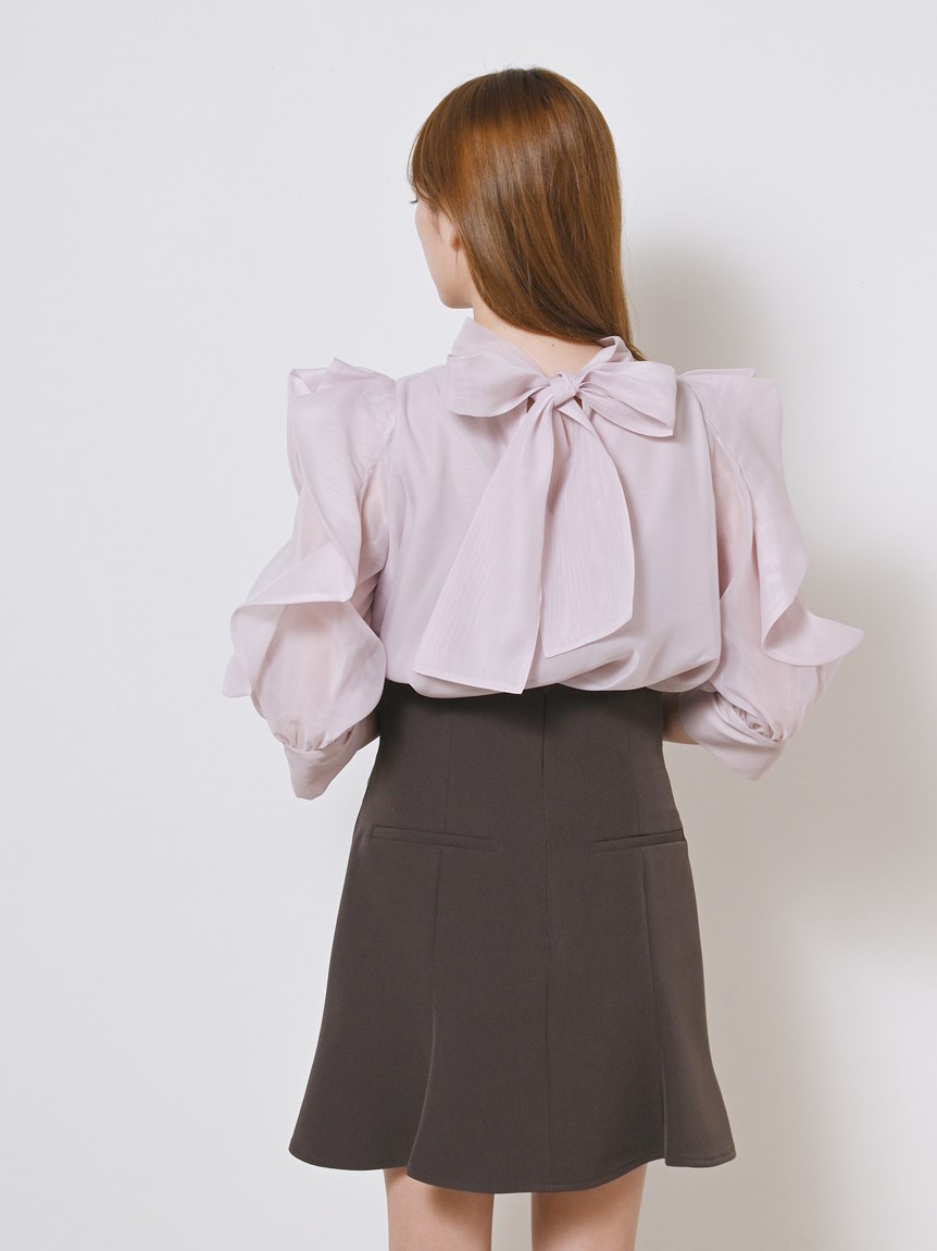 エレガントに広がるフリルがあしらわれたボリュームスリーブが印象的な、レディ度満点のブラウス。