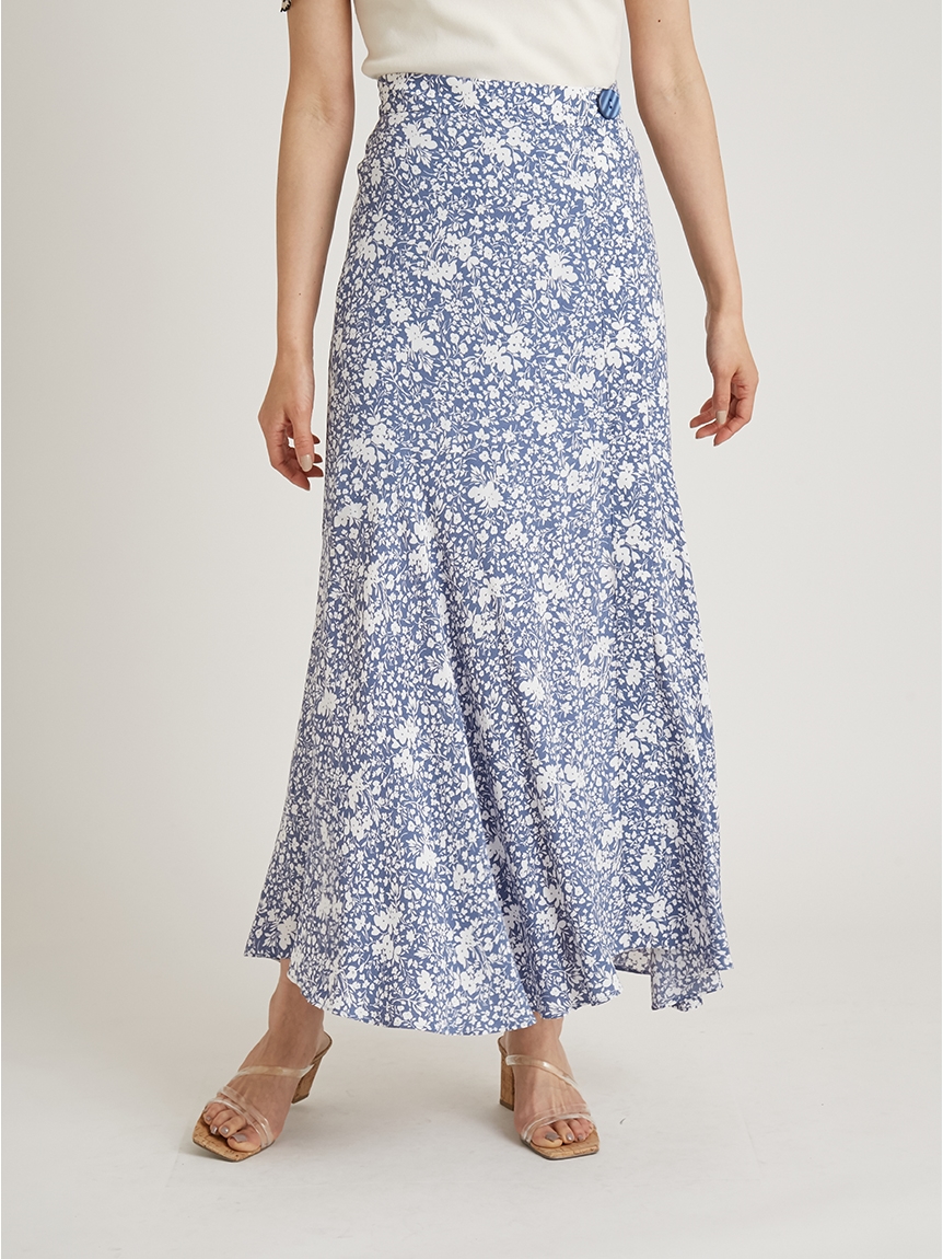 プラスワンでスタイリングが一気に華やぐ、オリジナルプリントのロングスカート。切り替え部分から緩やかに広がるナローマーメイドシルエットで、洗練フェミニンに仕上げています。大きなボタンがあしらわれたラップ風のデザインで裾にスリットを入れ、動きのある表情を演出。甘トップスでとことんレディに着こなすのはもちろん、カジュアルなTシャツなどともマッチする万能な1着です。