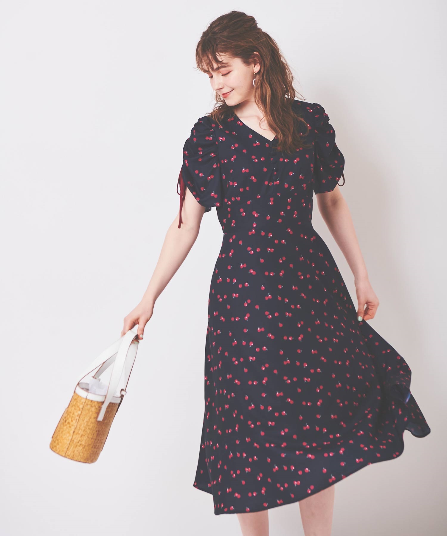 ランダムなリンゴ柄がドット柄見えするPOPなプリントワンピース。袖山シャーリングで袖口にはリンゴと同色のリボン付き。ハイウエスト切り替えでスタイルよく見せてくれる、夏らしく華やかなワンピース。