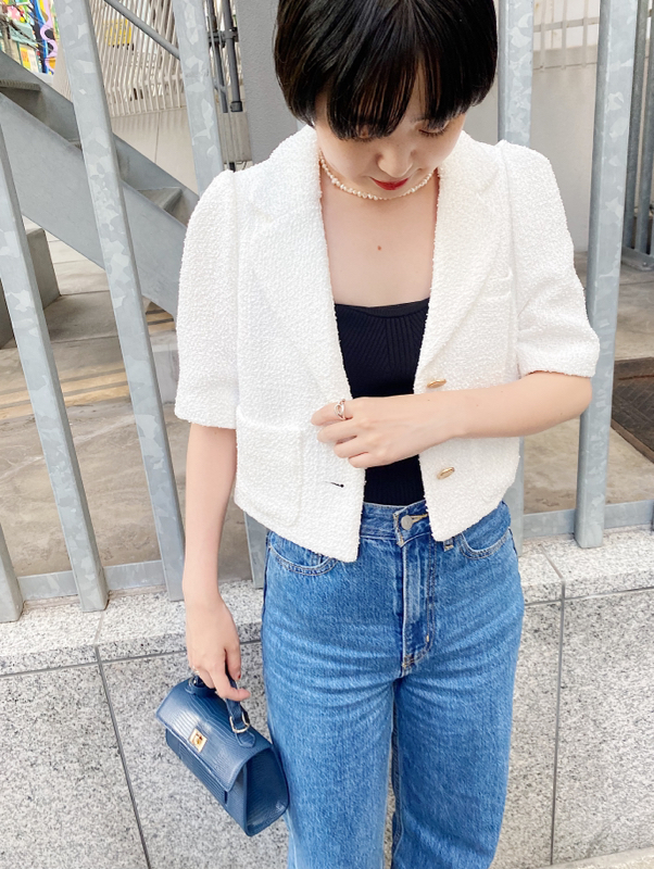 プラスワンでトレンド感がぐっと高まる、今季注目のハーフスリーブジャケット。タックを効かせ立体感を与えたスリーブ&コンパクトな身頃で女性らしく仕上げました。マットな光沢を放つフロントのボタンが上品なアクセントに。レングスをジャストに仕立てているので様々なボトムと相性が良く、同素材のスカート(SWFS222100)とセットアップでスタイリングするのもおすすめです。
