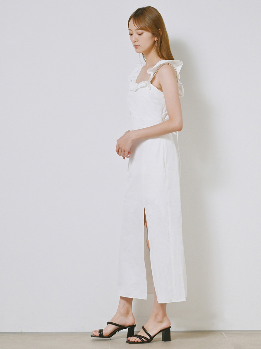 ネックラインからスリーブに続くフリルが印象的な、夏らしい軽快な愛らしさを振りまくノースリーブワンピース。すっきりとしたIラインシルエットで、大人っぽく上品なルックスに仕上げています。裾に入れた深めのスリット&背中の大胆な開きで、トレンド感のあるヘルシーな肌見せを演出。バックには2箇所にリボンをあしらい、後ろ姿まで女性らしく魅せています。