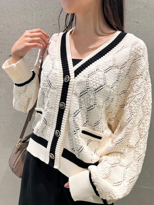 全体に浮かぶ透かし編み模様が印象的な、春夏の着こなしにぴったりの涼し気なニットカーディガン。配色のライン&オリジナルのロゴボタンで、プレッピーなデザインに仕上げました。抜け感たっぷりに着られるややルーズなシルエット。レングスをジャストにしているのでパンツともスカートとも合わせやすく、幅広いコーディネートに活躍してくれます。
