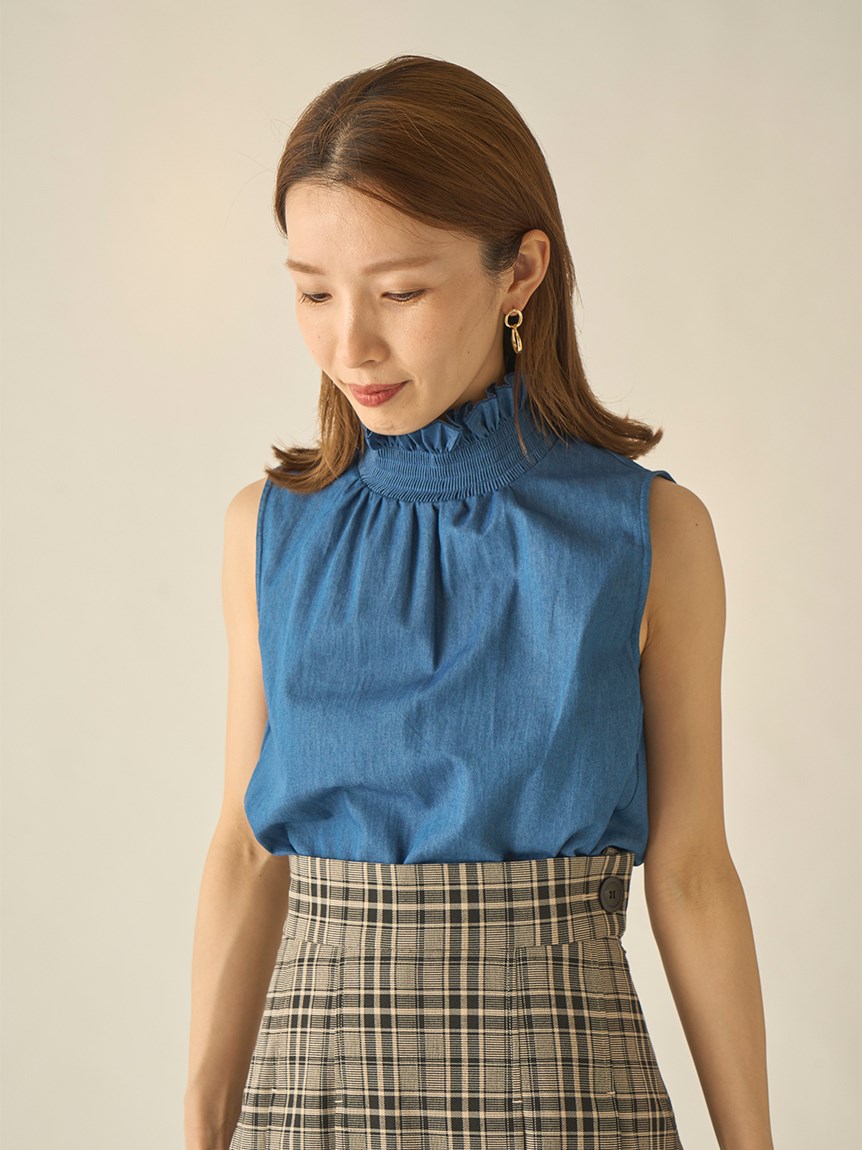 シャーリングを効かせたスタンドカラーがクラシカルな印象を作り上げるノースリーブブラウス。バックネックのスリットから程よい肌見せができ、後ろ姿まで女性らしく演出しています。ボトムスにインしてもアウトでもバランス良く決まるすっきりとしたシルエット。一枚での着用はもちろん、襟だけを出すトレンドのレイヤードスタイルにもぴったりな万能アイテムです。