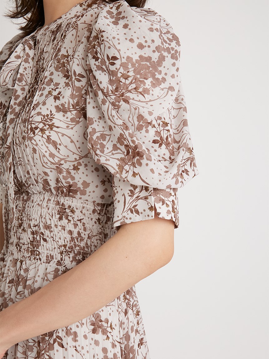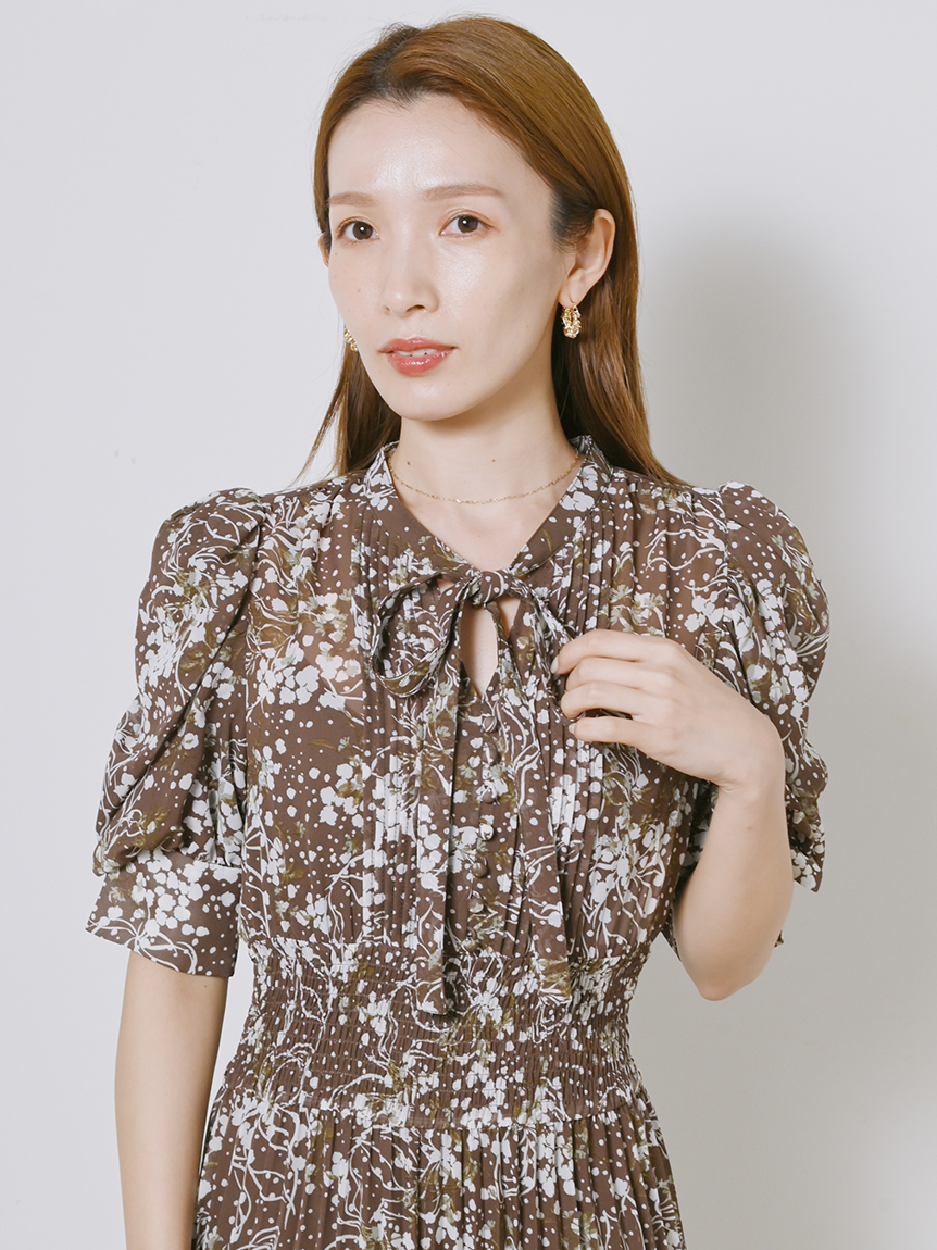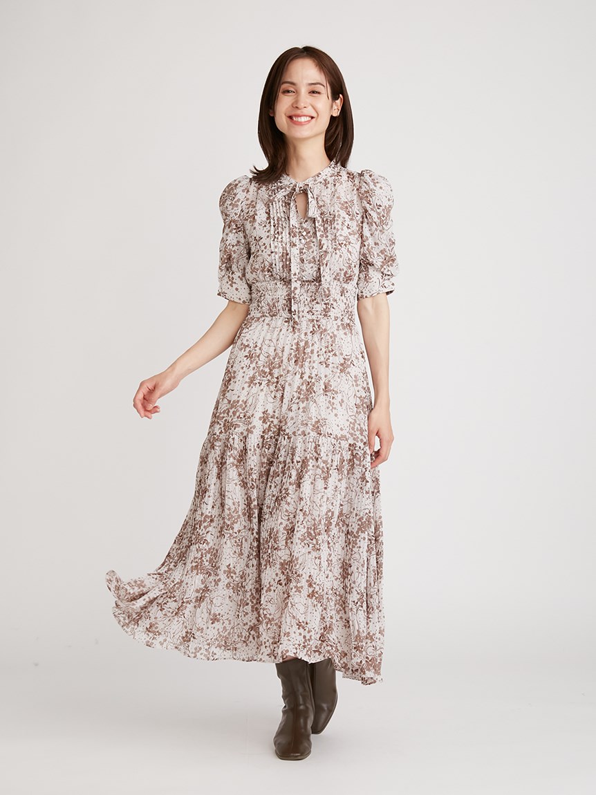 細部までこだわった線と花のシルエットが華やかなプリントを施しました。優しい印象を与えるピンクベージュ、シーズンムード薫るブラウン、トレンドライクなラベンダーの3色展開でお届けします。