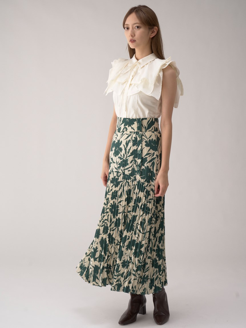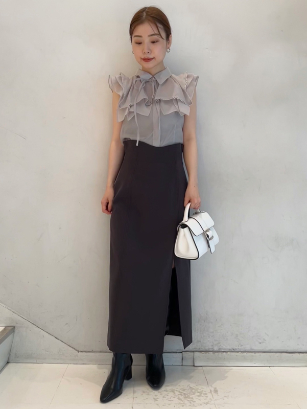 ひらりと軽やかに揺れるティアードフリルが印象的な、華やかな雰囲気のノースリーブブラウス。スクエア型にすることで甘さを程よく抑え、トレンドライクに仕上げました。さり気なく施されたレースのトリミングが女性らしさを高めるポイント。ボディラインに沿うすっきりとしたシルエットなので、ボトムにインしてもアウトでもバランス良く合わせられます。