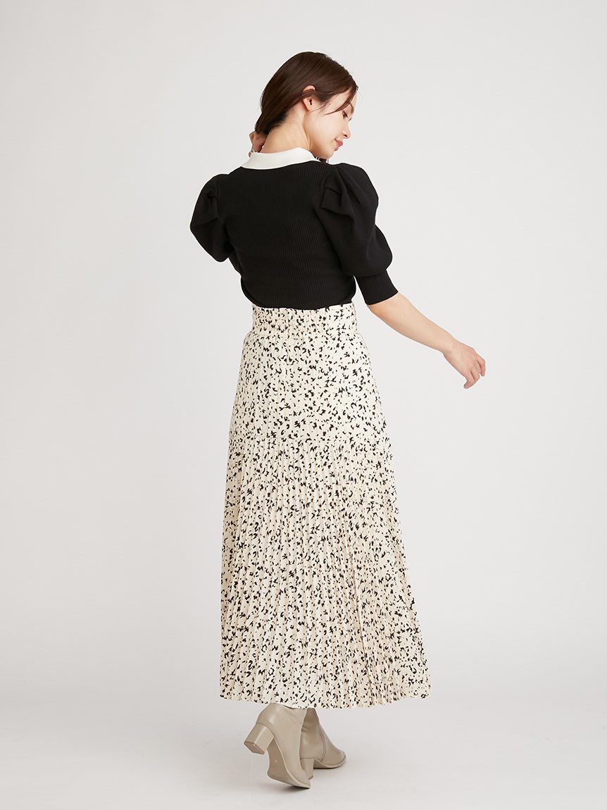 動作のたびに揺れる軽やかなフレアシルエットが印象的な、レディムード溢れるロングスカート。プリーツの幅を変えて切り替えを入れることで表情豊かに仕上げました。裾部分にはマチ切り替えを入れ程よくボリュームをもたせています。フロントサイド部分にはボタンをあしらいさり気ないアクセントをプラス。バックウエストはゴム仕様なので身体に程よくフィットし、穿き心地も快適です。