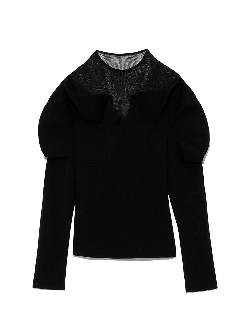 透け感のあるセンシュアルなデコルテとコルセットライクな身頃との絶妙なバランス感が魅力。「SNIDEL」定番のデコルテシースルーニットをモードに昇華させたこだわりの1着が届きました。前後に彩られたボリューミーなフリルでぐっと華やかな雰囲気に。オフショルにアレンジすることも可能なので、着こなしを自由に楽しめます。
