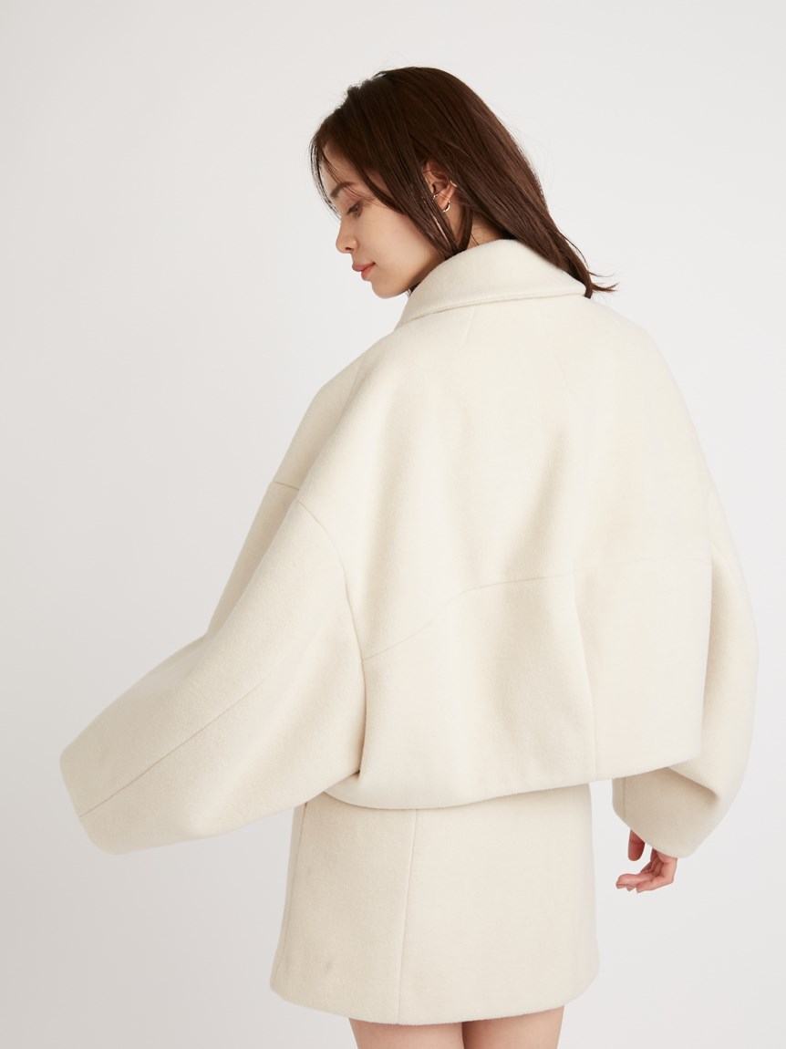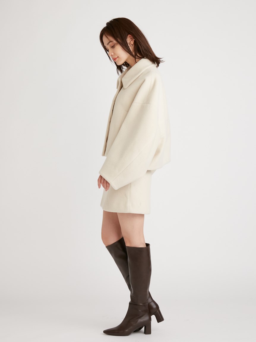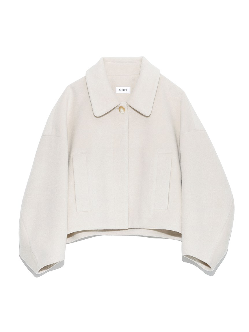 昨シーズン人気を集めたショートコートが今季も登場。ふんわりと丸みのある立体的なオーバーサイズシルエットが女性らしさを高めてくれる1着です。装飾を最小限に抑えたベーシックなデザインで着まわし力は抜群。ゆるめのシルエットながら、レングスをジャスト丈に仕立てているのでパンツともスカートとも合わせやすく、幅広いコーディネートに活躍してくれます。同素材を用いたスカート(SWFS224042)とセットでスタイリングするのもおすすめ。