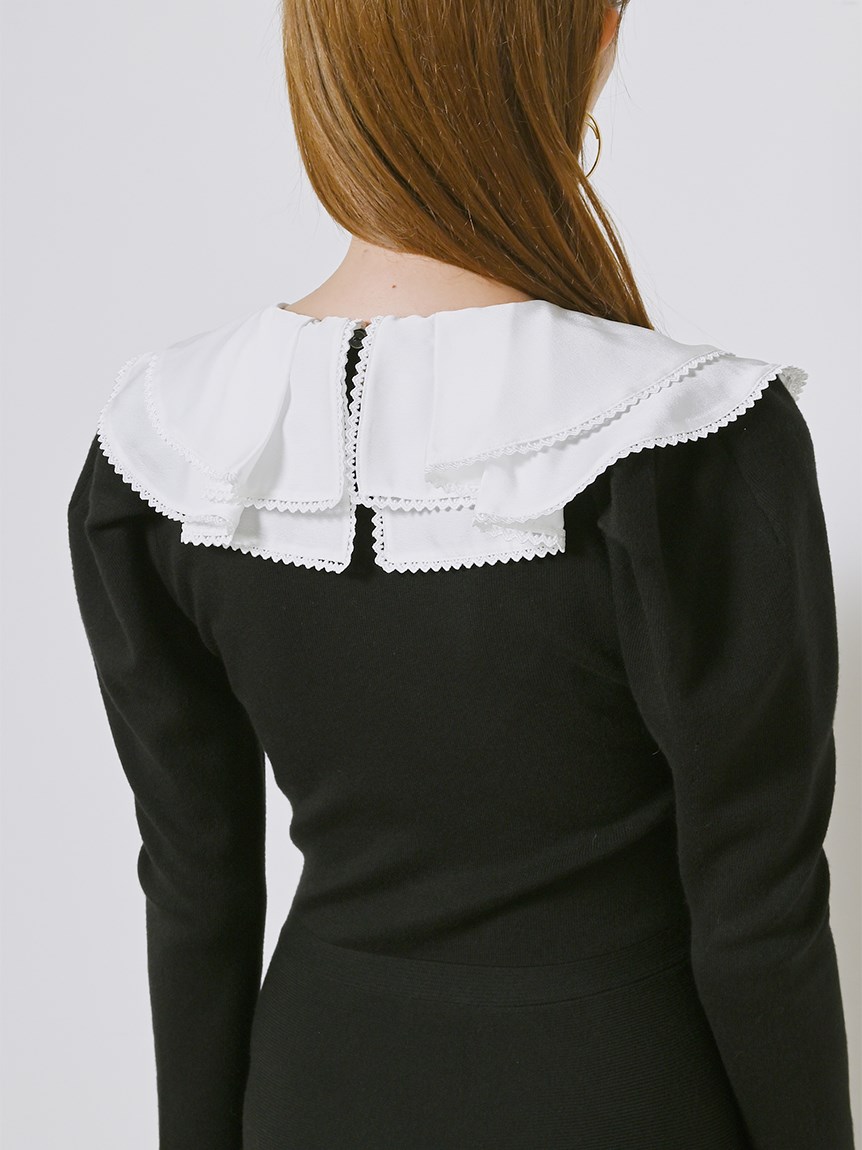 2枚の重ねにした繊細なデザインの襟が印象的な、クラシカルな雰囲気のニットワンピース。やや大きめの流れるような形状と端に縫われたレーステープで女性らしさを際立たせます。ウエストの切り替えラインがメリハリを与えスタイルアップを実現。ドラマチックなフレアシルエットで品が良く幅広いシーンに最適なアイテムです。