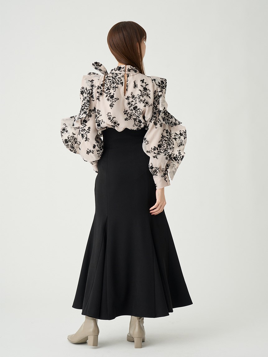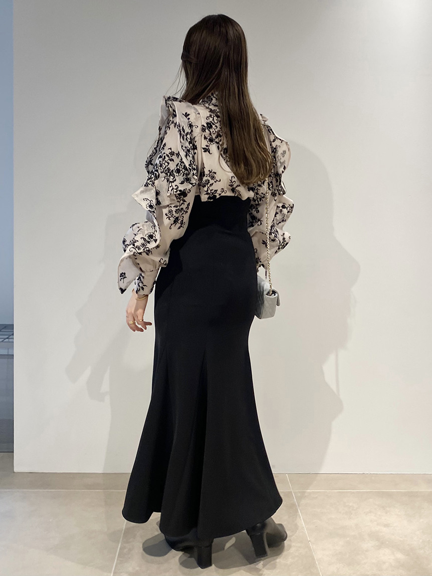 【重厚感のあるフロッキープリントを浮かべた定番シースルーブラウス】