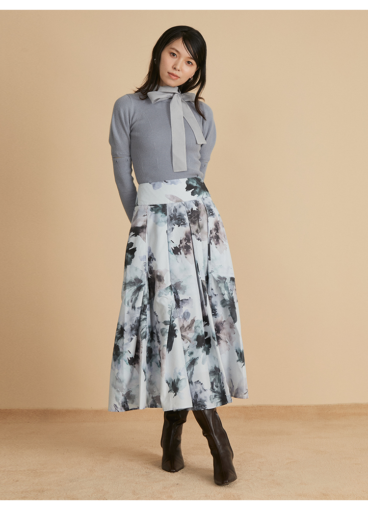 伸縮性のあるリブニットとシアーな布帛を組み合わせました。ワントーンで品良くまとめたホワイトとサックス、配色で切り替えたネイビーの3色展開でお届けします。