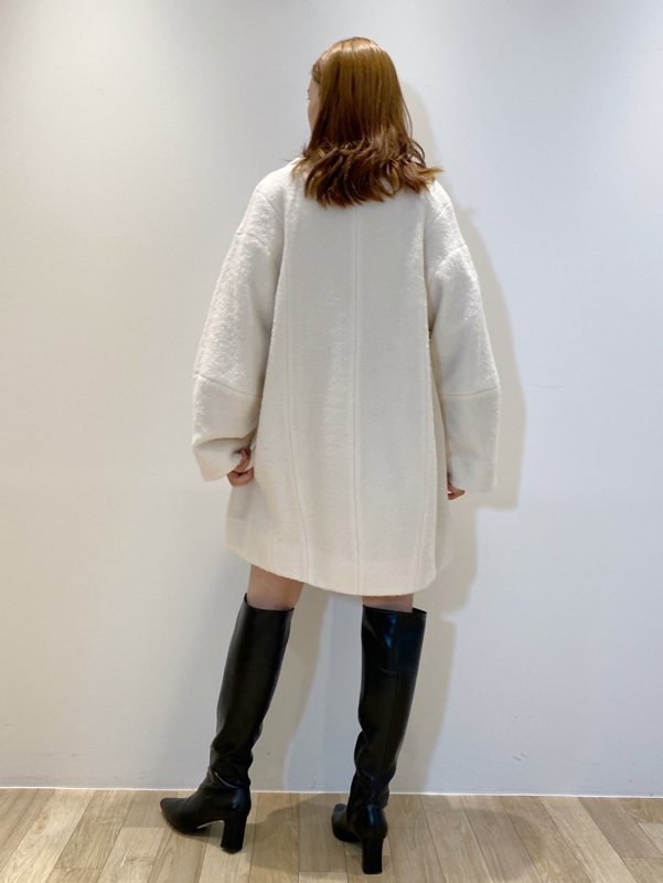 トレンドライクな構築的なシルエットが特徴的なミディ丈コート。フロントはハンサムなダブル仕様ながら、大ぶりな襟や丸みのあるシルエットが女性らしさを引き立てます。モード感はありつつも、着まわしやすいのも魅力。今年らしいミニ丈ボトムとロングブーツを合わせたトレンド感満載のスタイリングや裾からフレアやっぷりのスカートを覗かせるのもオススメです。
