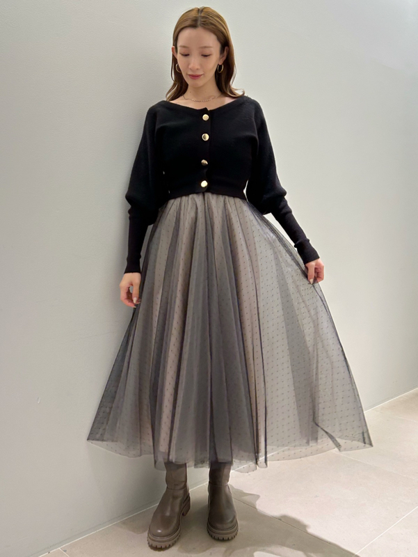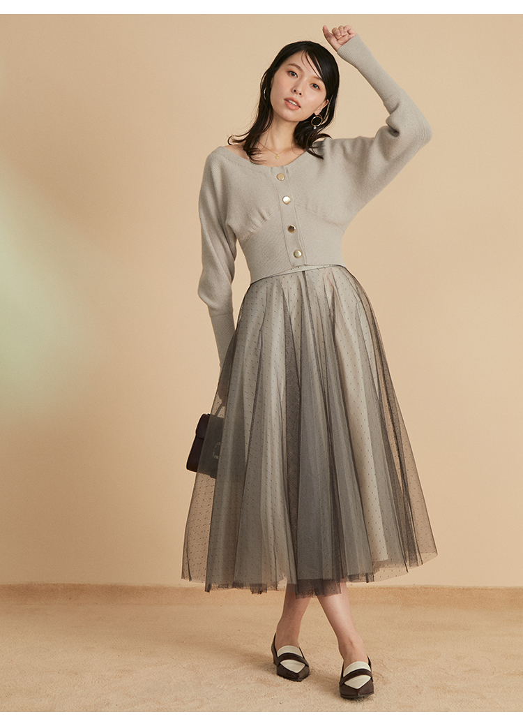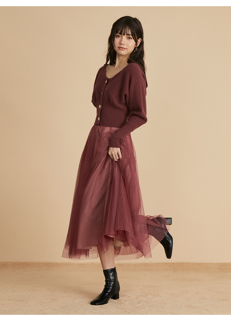 きれいめな質感のニットとドット模様が浮かぶシアーなチュール素材を組み合わせました。落ち着いた印象を与えるブラック、淡い色合いが女性らしいライトベージュ、華やかな雰囲気のバーガンディの3色展開でお届けします。