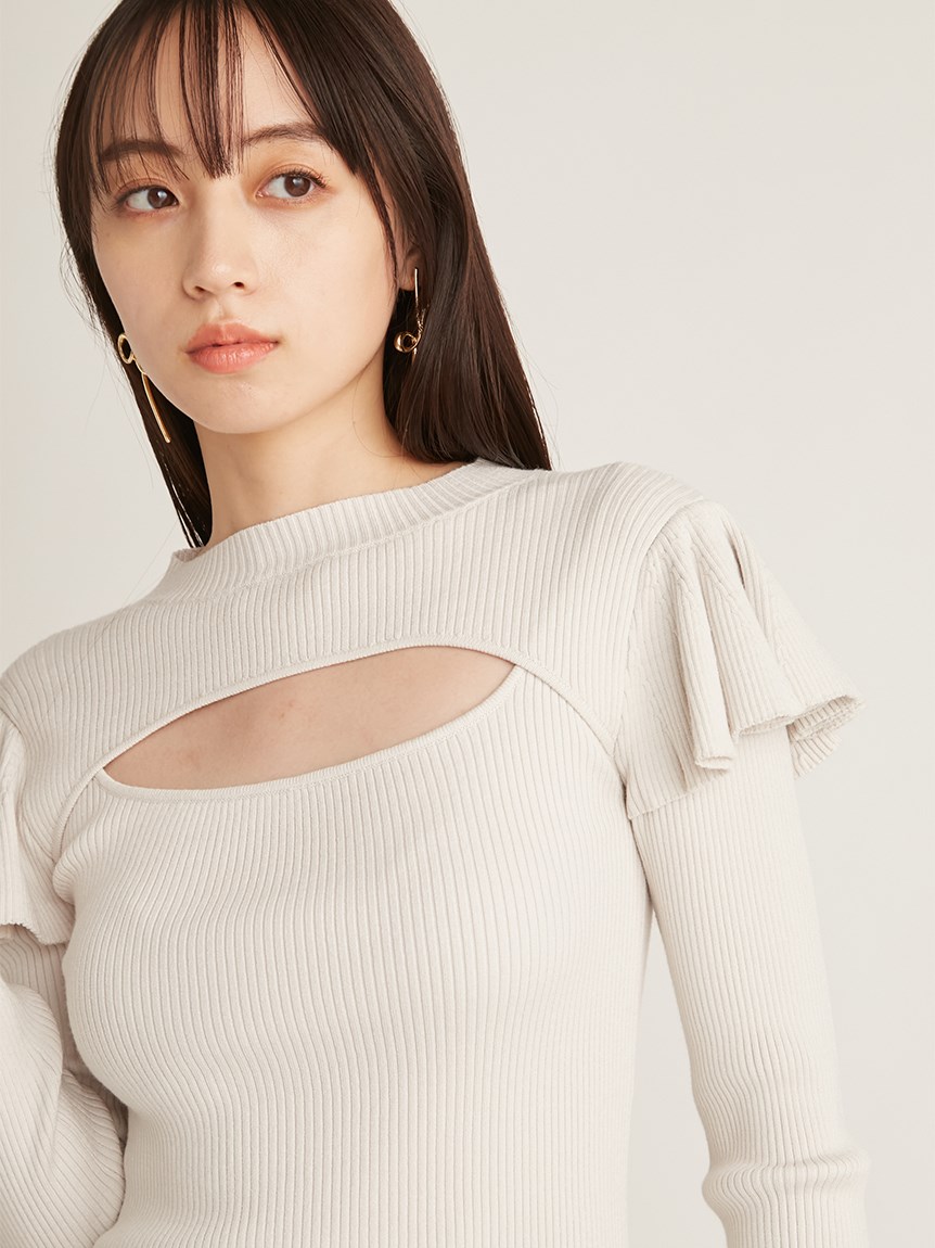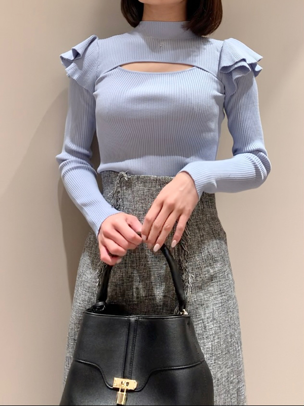 デコルテのカッティングが印象的な、今年らしい肌見せを叶えてくれるニットトップス。袖にはフリルパーツを挟み込むことで「SNIDEL」らしさをプラス。1枚でも華やかに決まる優秀アイテムです。ボディラインにフィットするタイトなシルエットなので合わせるボトムを選ばず幅広く活躍してくれます。